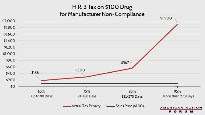 H.R. 3, “The Lower Drug Costs Now Act of 2019,” requires manufacturers to negotiate the price of certain drugs with the Secretary of Health and Human Services, and if the manufacturer does not comply, the bill would impose an excise tax on the sales of the manufacturer. This tax has been portrayed as equaling a percentage of sales that ranged from 65 percent for the first 90 days of non-compliance to 95 percent for any period greater than 270 days. These rates, however, do not accurately reflect the penalty that will be assessed. These rates are proportions that are then used to determine the actual tax rates. These rates range from 186 percent of sales for the first 90 days of non-compliance to 1,900 percent of sales after 270 days of non-compliance.
