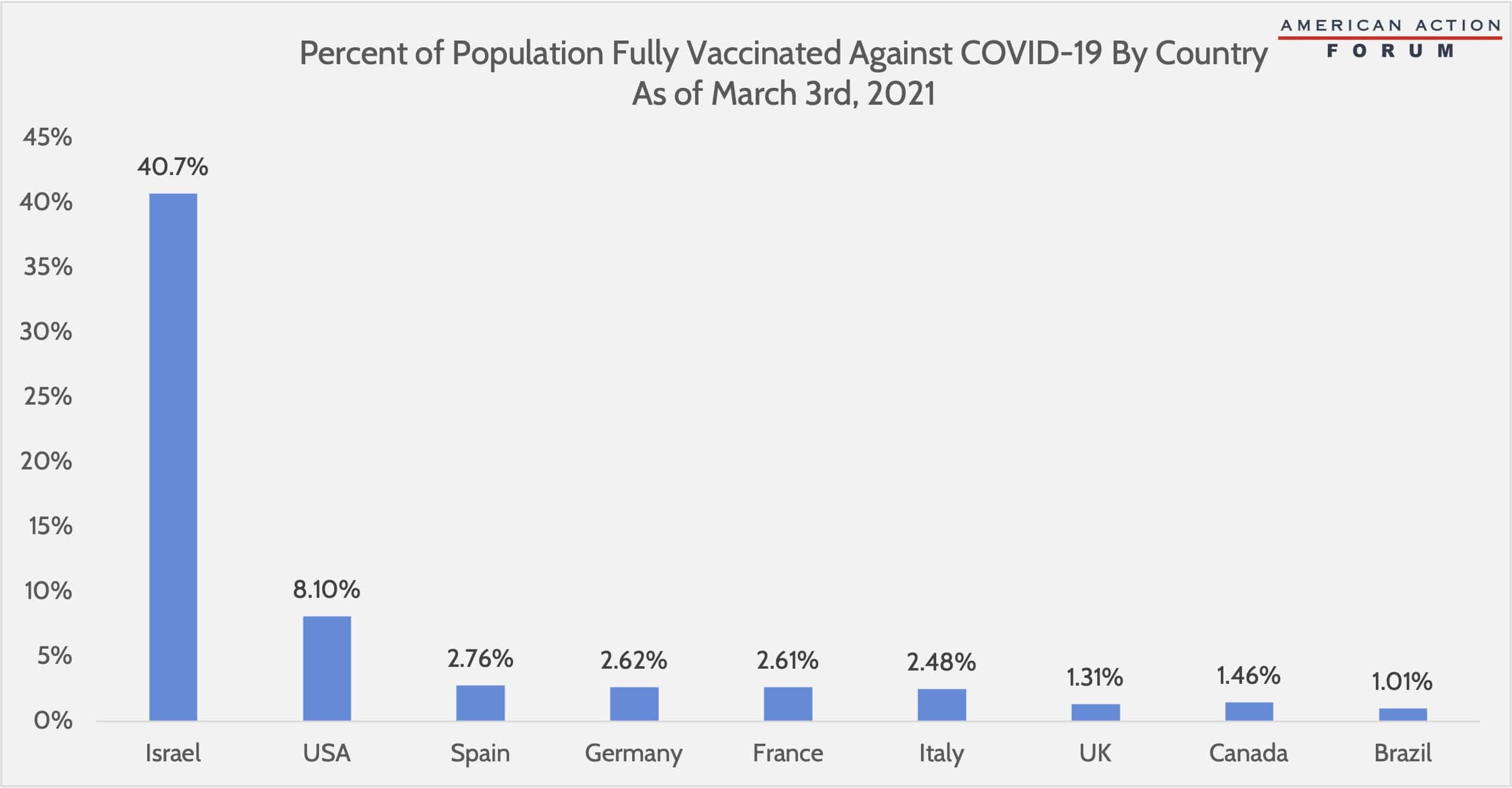 Last week, the Food and Drug Administration approved emergency use of the Johnson & Johnson single-dose COVID-19 vaccine, which is expected to drastically speed up the vaccination process. Additionally, this week the Biden Administration announced a deal between Merck and Johnson & Johnson to further expedite the production and distribution process. These developments make Biden’s promise of enough vaccine for every American adult by the end of May a more realistic proposition. The United States initially experienced numerous hurdles in the COVID-19 vaccine rollout, but it has some of the most aggressive vaccine-administration rates in comparison to other leading nations, as the chart below shows. As of March 3rd, Israel has the greatest proportion of its population fully vaccinated against COVID-19, having vaccinated just over 40 percent. While these rates are impressive, Israel’s total population equals just under 3 percent of the entire U.S. population, and its landmass equals that of New Jersey. Further, Israel stores over 5 million vaccines in a centralized facility, minimizing disruption during vaccine distribution to other regions within the nation. As shown in the chart below, many European nations have a slower administration rate, having fully vaccinated approximately 2.6 percent of their total populations thus far, as seen in Spain, Germany, France, and Italy, all displaying similar rates.